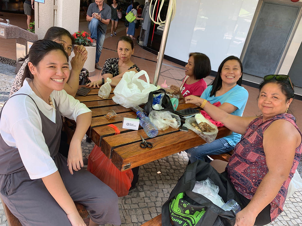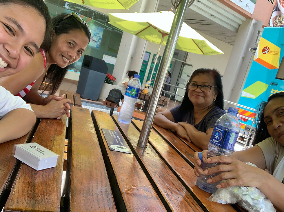 I began this task during lunchtime on a Thursday. It was a scorching, hot day, yet a lot of domestic helpers crowded the main plaza at Discovery Bay eating lunch together. A few of them supplied and provided the food and shared it with the rest of them at the plaza. From that, I was already able to see the strong sense of community they had.